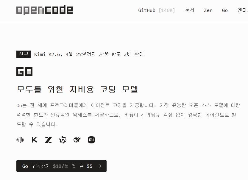 | 예산이 매우 제한적이시다 | OpenCode Go | 첫 달 $5(다음달 $10)로 부담 없이 시작하실 수 있습니다 |
