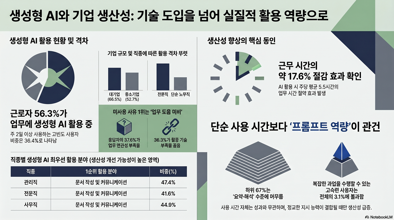 결론적으로는 단순히 오래 사용하는 것보다는 '프롬프트 작성 역량' 등 효과적인 활용 능력을 갖추었을 때 생산성 개선 효과가 훨씬 명확하게 나타납니다는 것입니다.